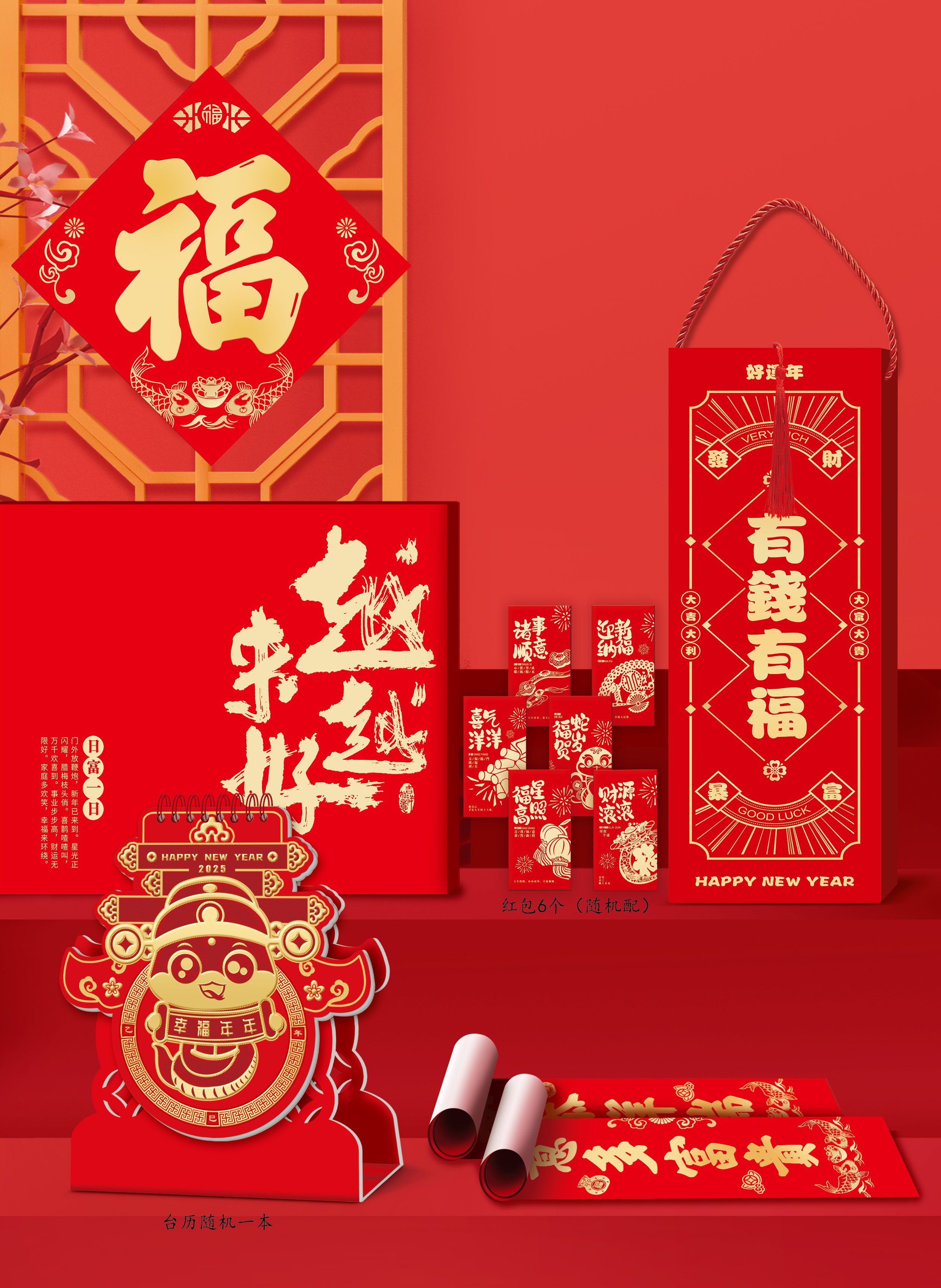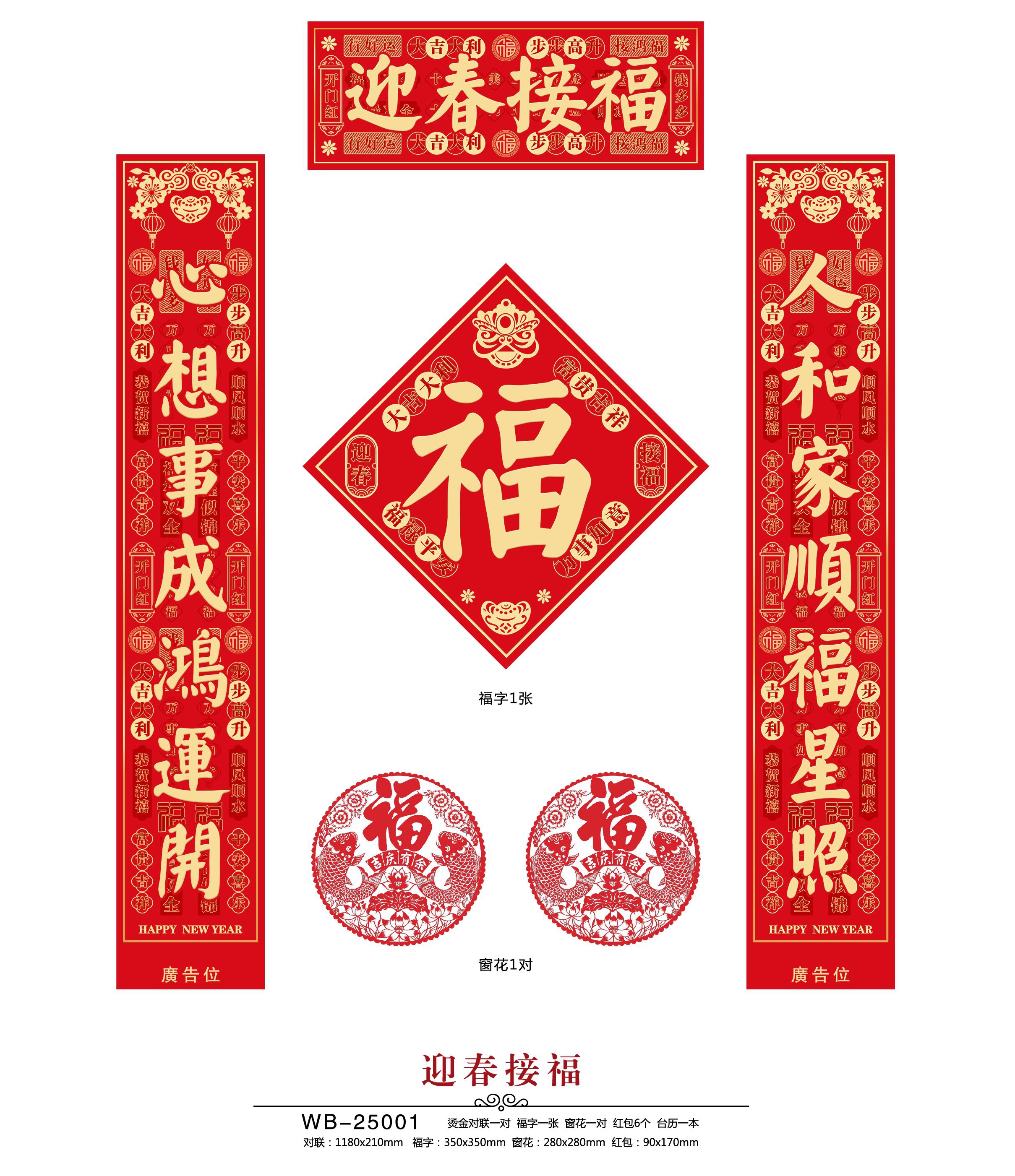 燙金對聯(lián)一對,福字一張,窗花一對,紅包6個,臺歷一本 對聯(lián):1180x210mm 福字:350x350mm