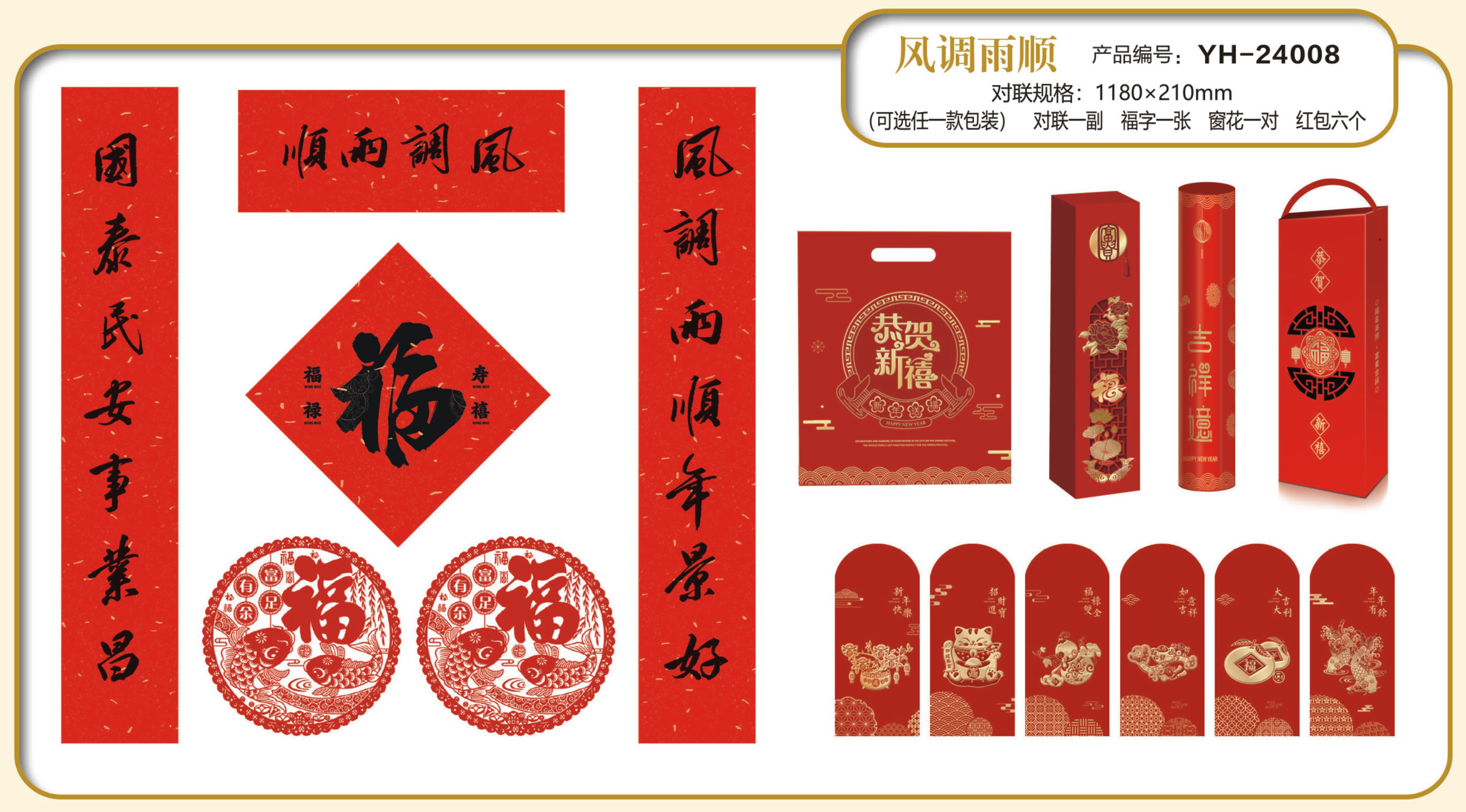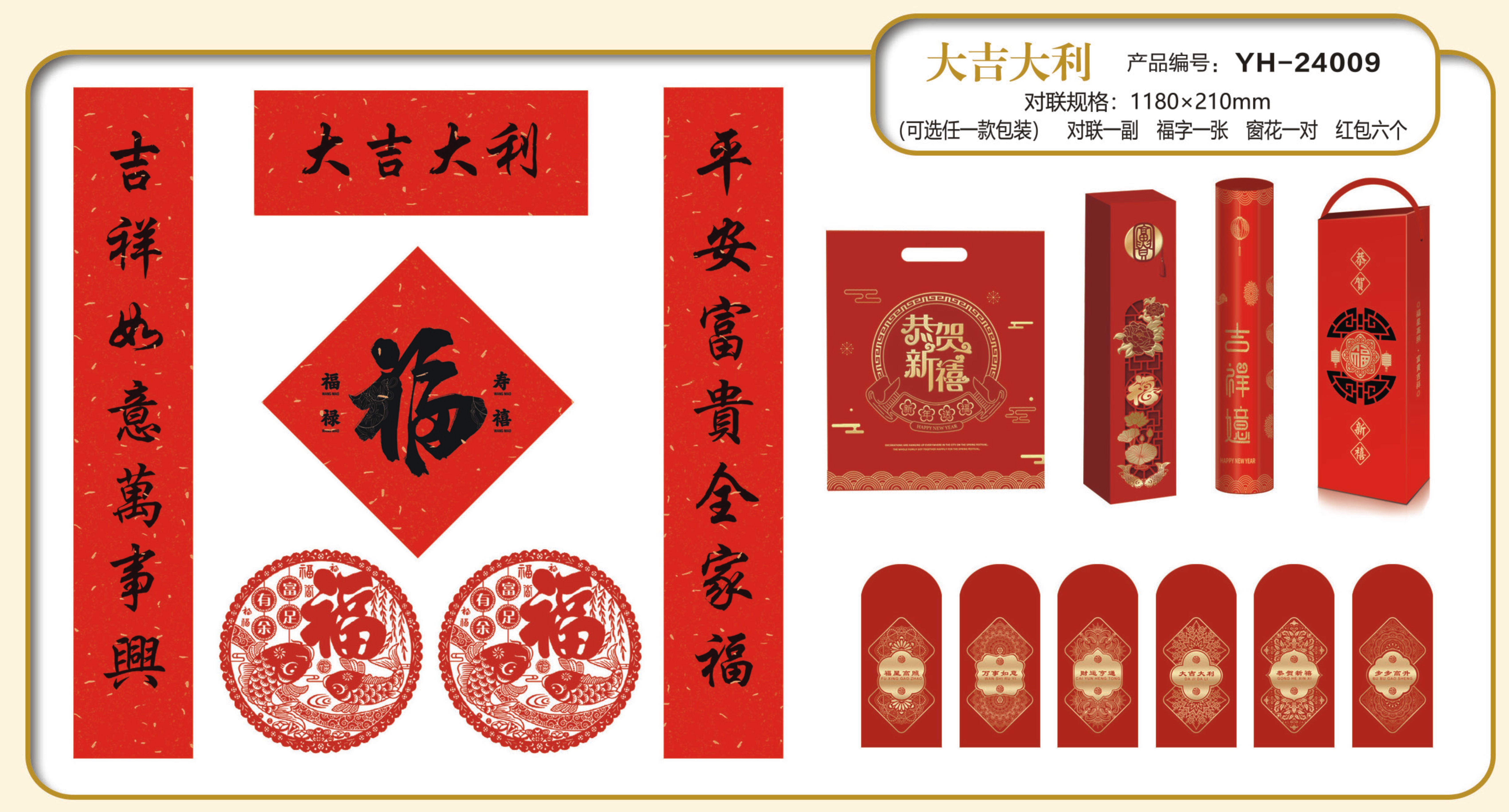 (可任選一種包裝)對聯(lián)一幅;窗花一對;福貼一張;利事封六個(gè)