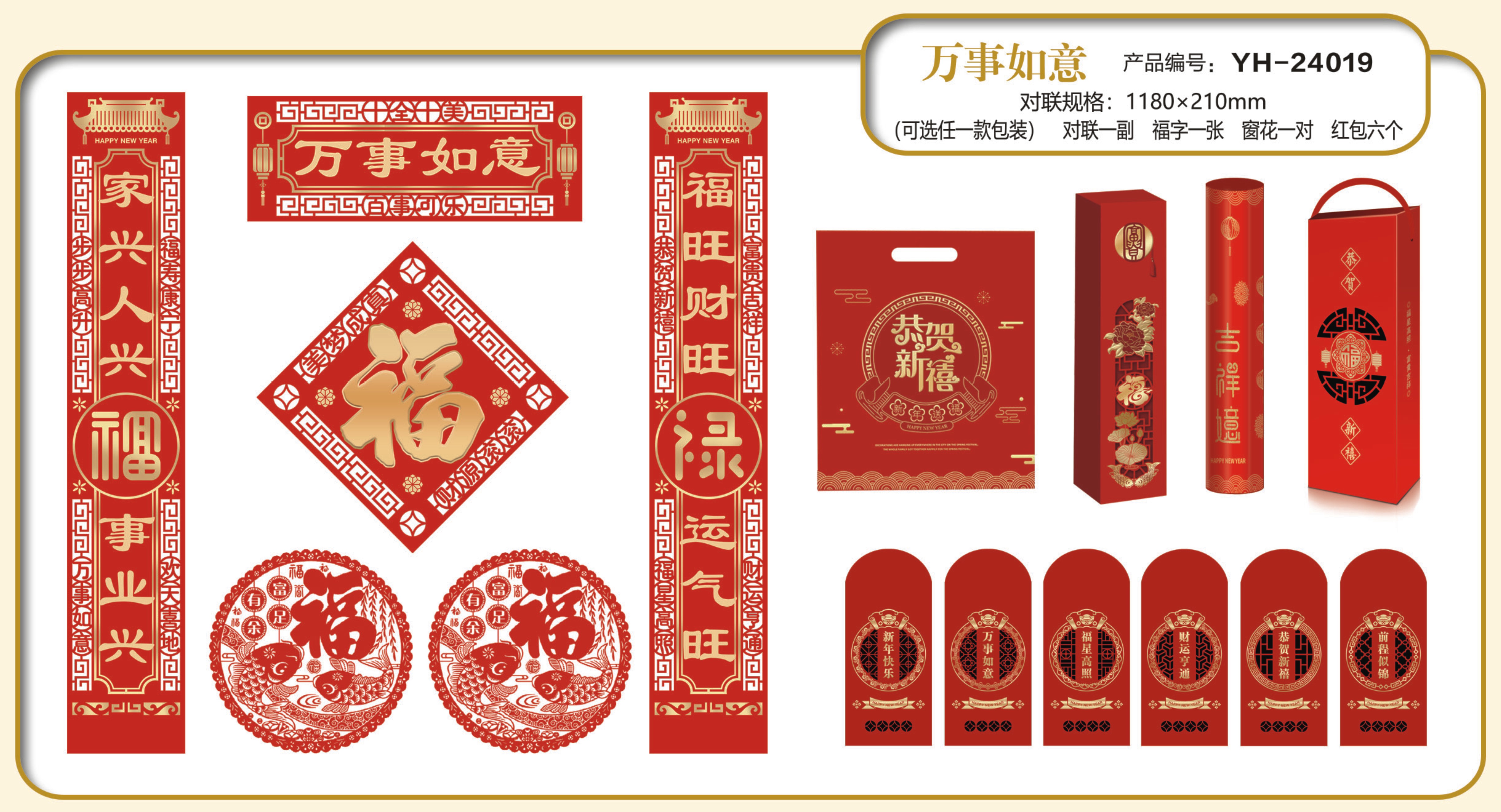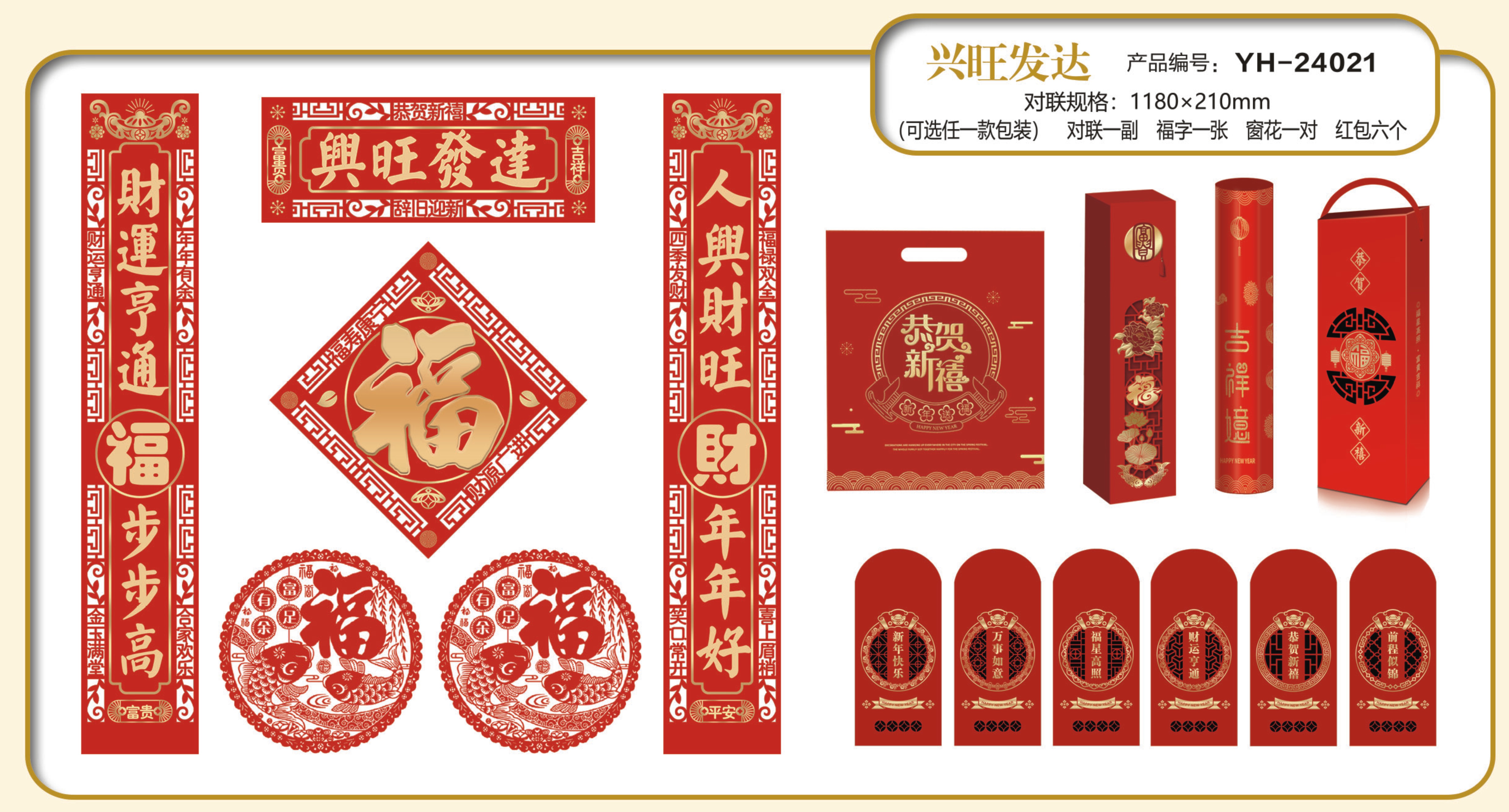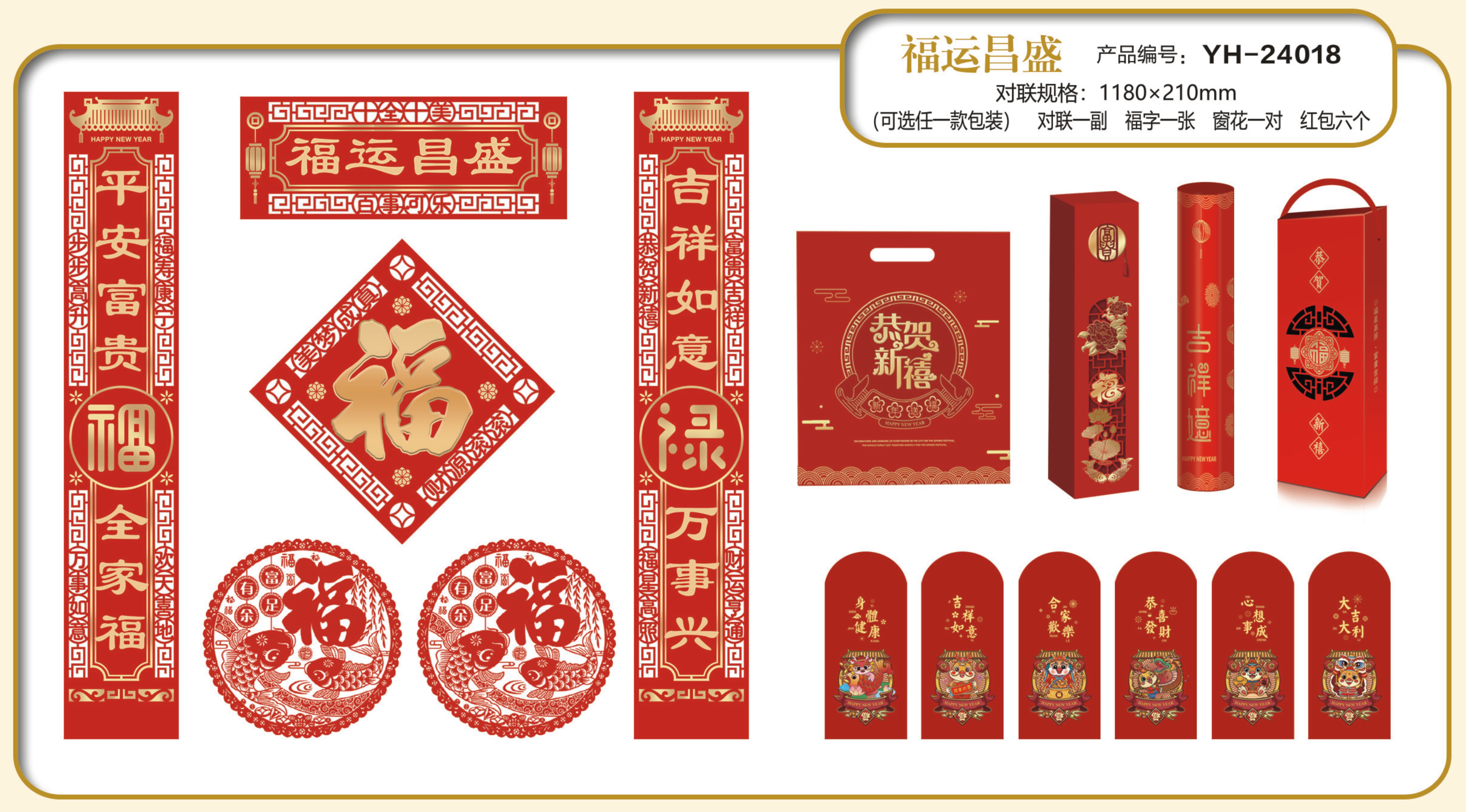 (可任選一種包裝)對(duì)聯(lián)一幅;窗花一對(duì);福貼一張;紅包六個(gè)
