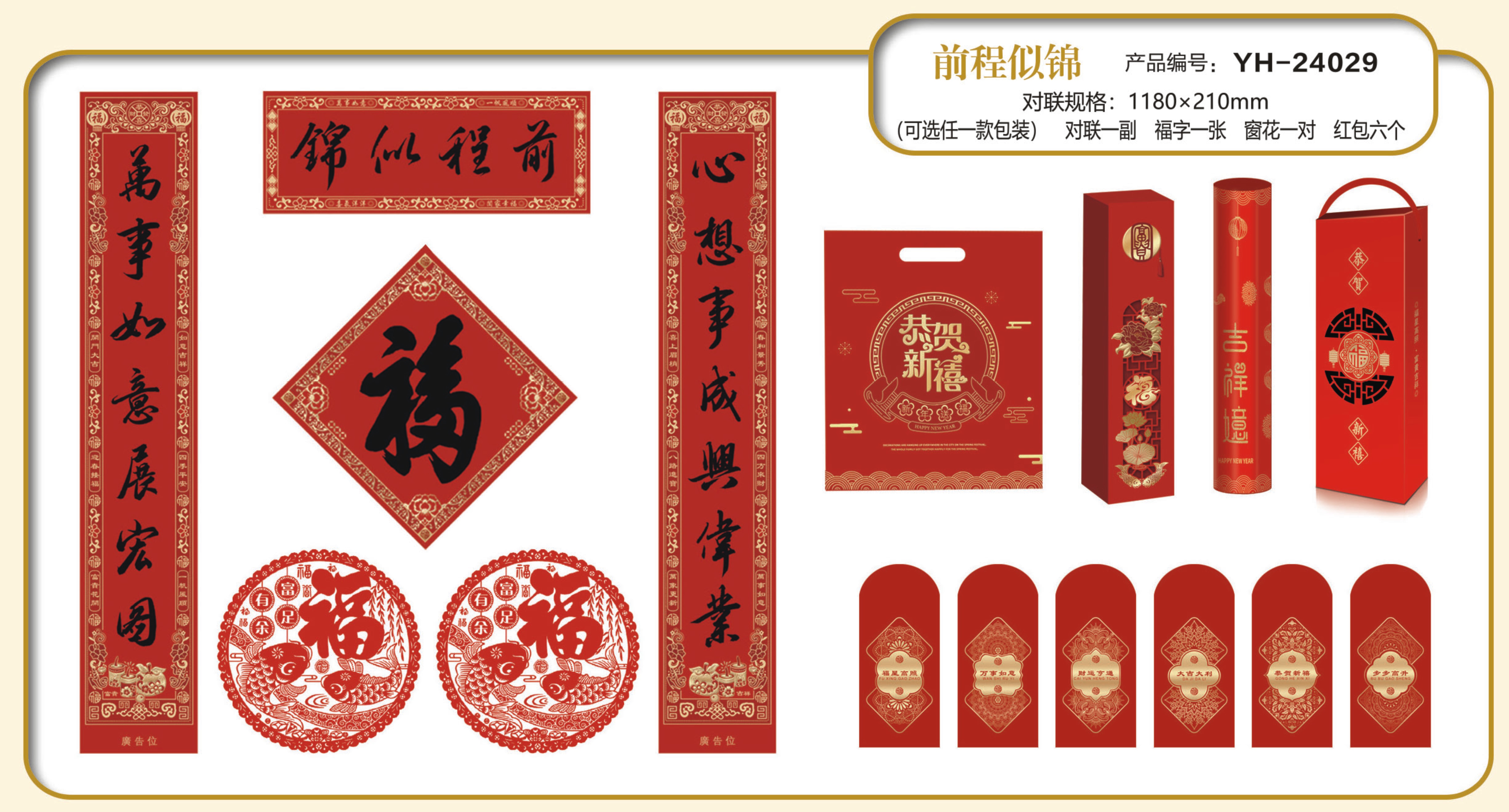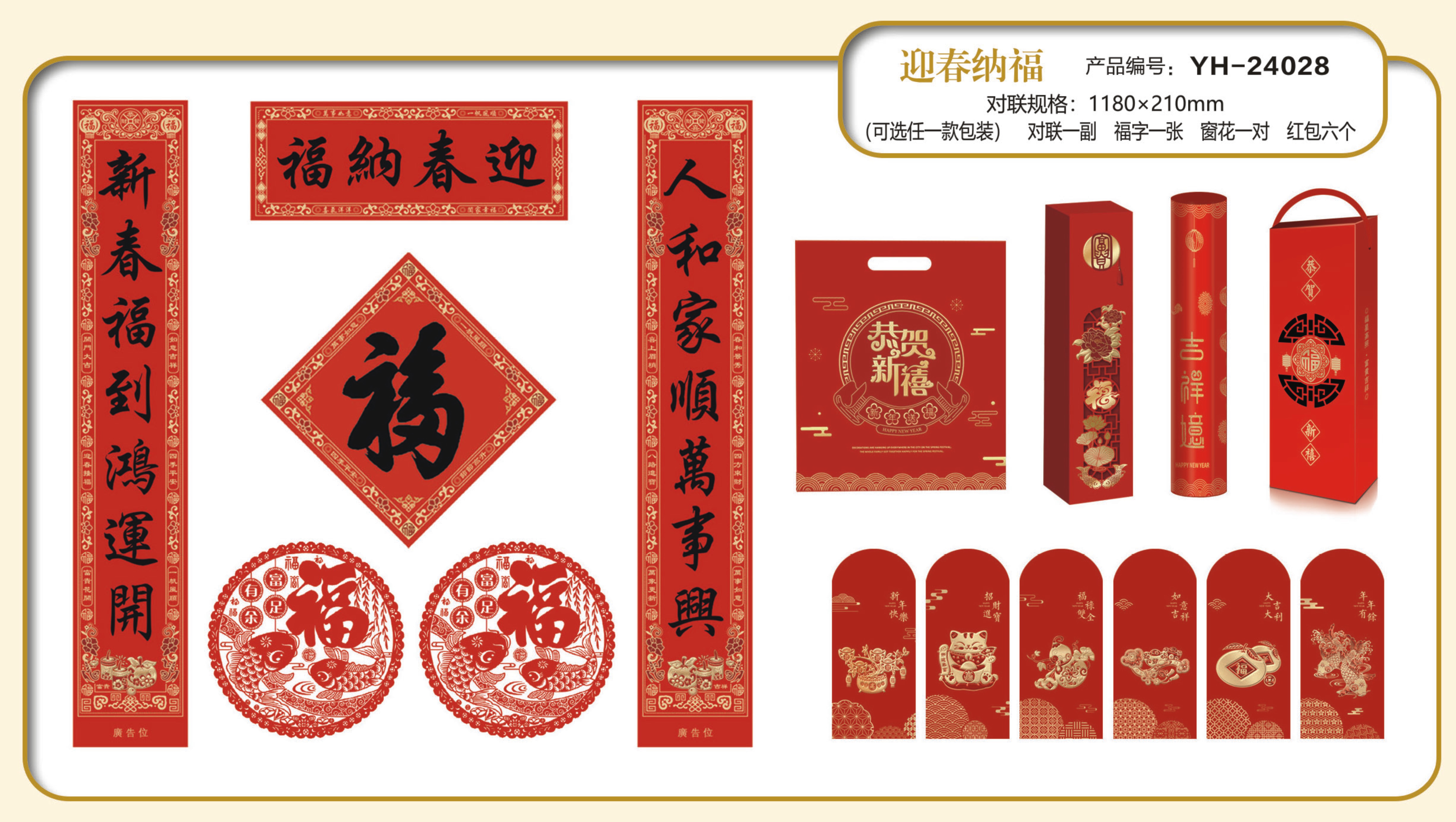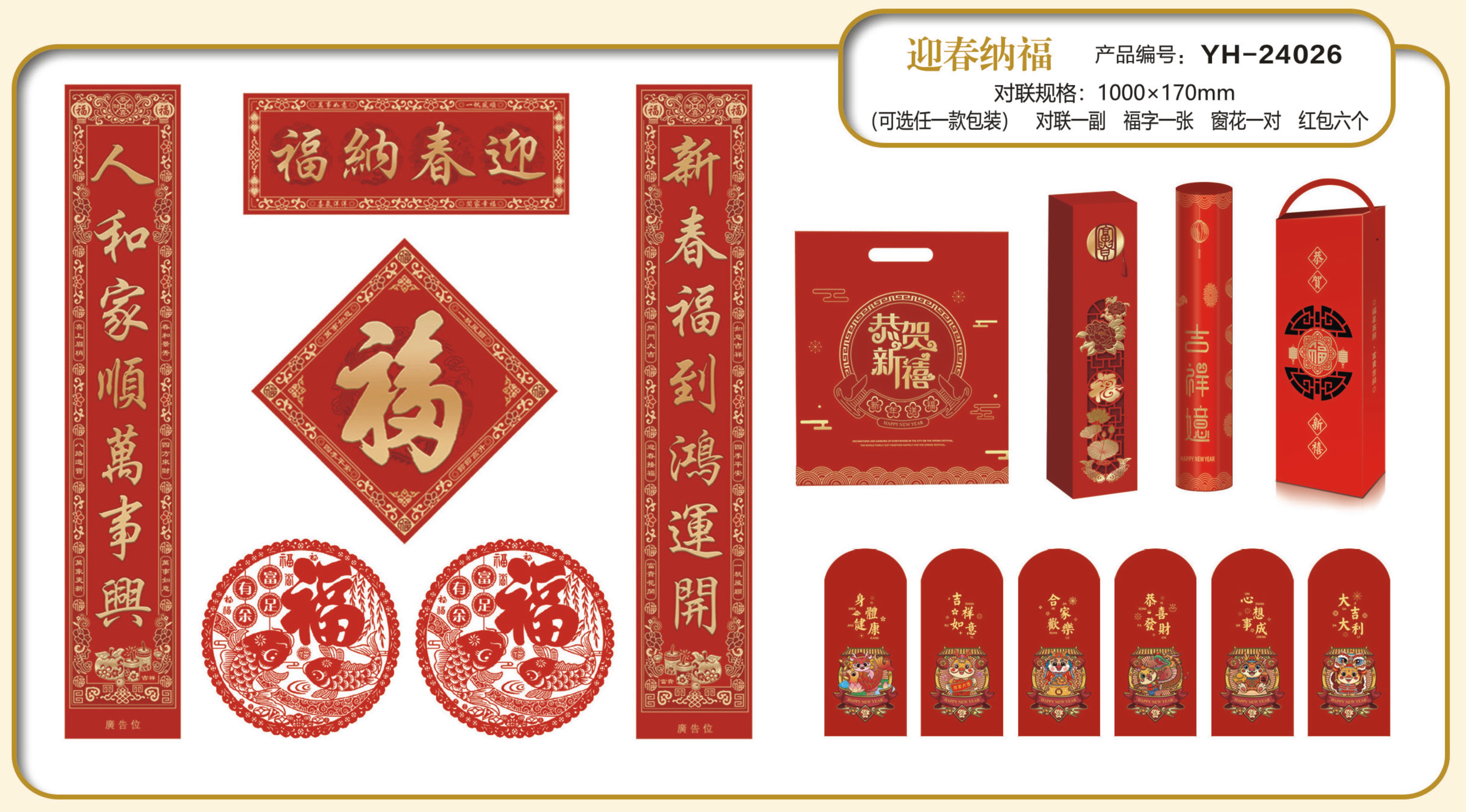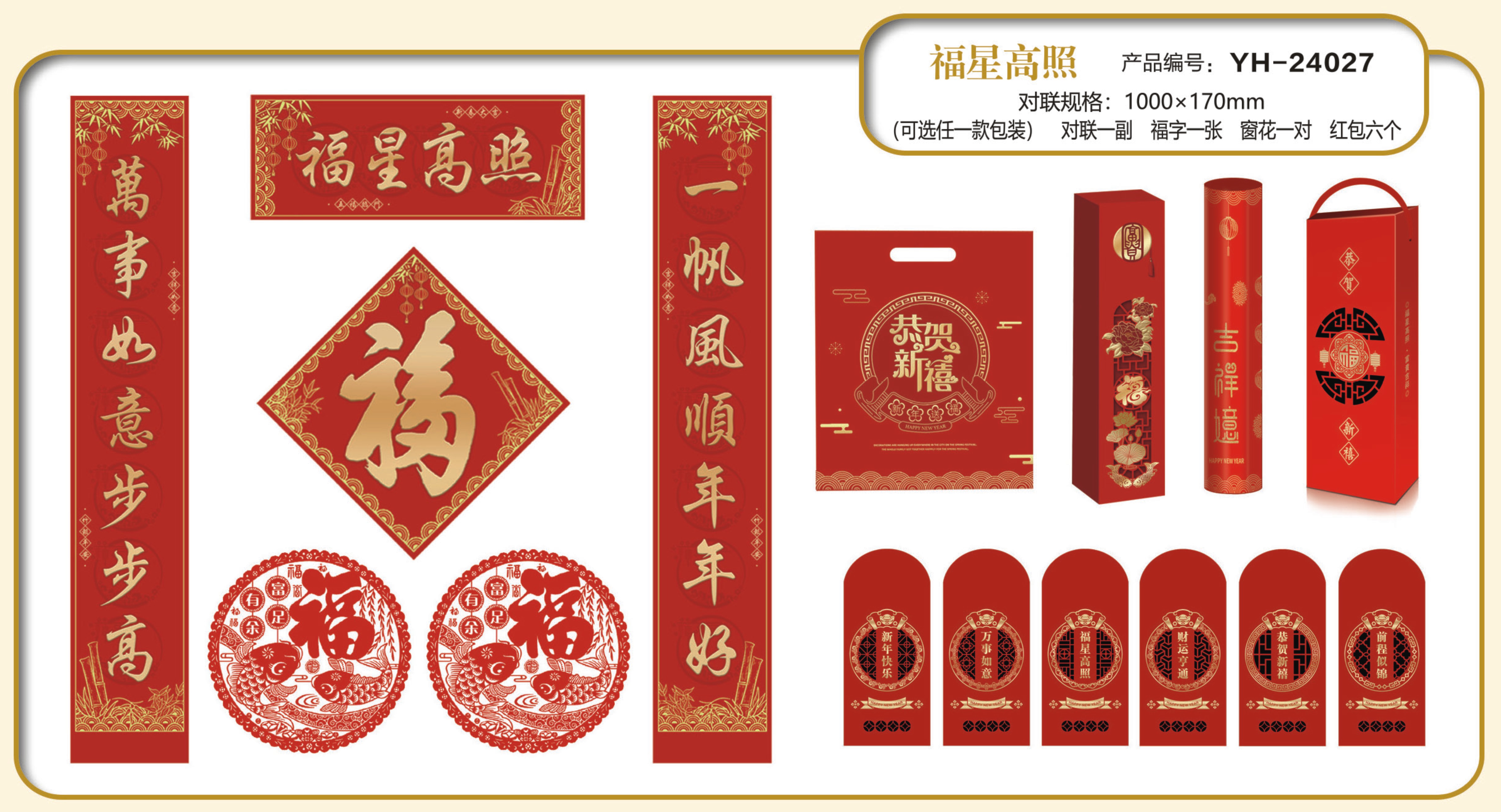(可任選一種包裝)對(duì)聯(lián)一幅;窗花一對(duì);福貼一張;紅包六個(gè)