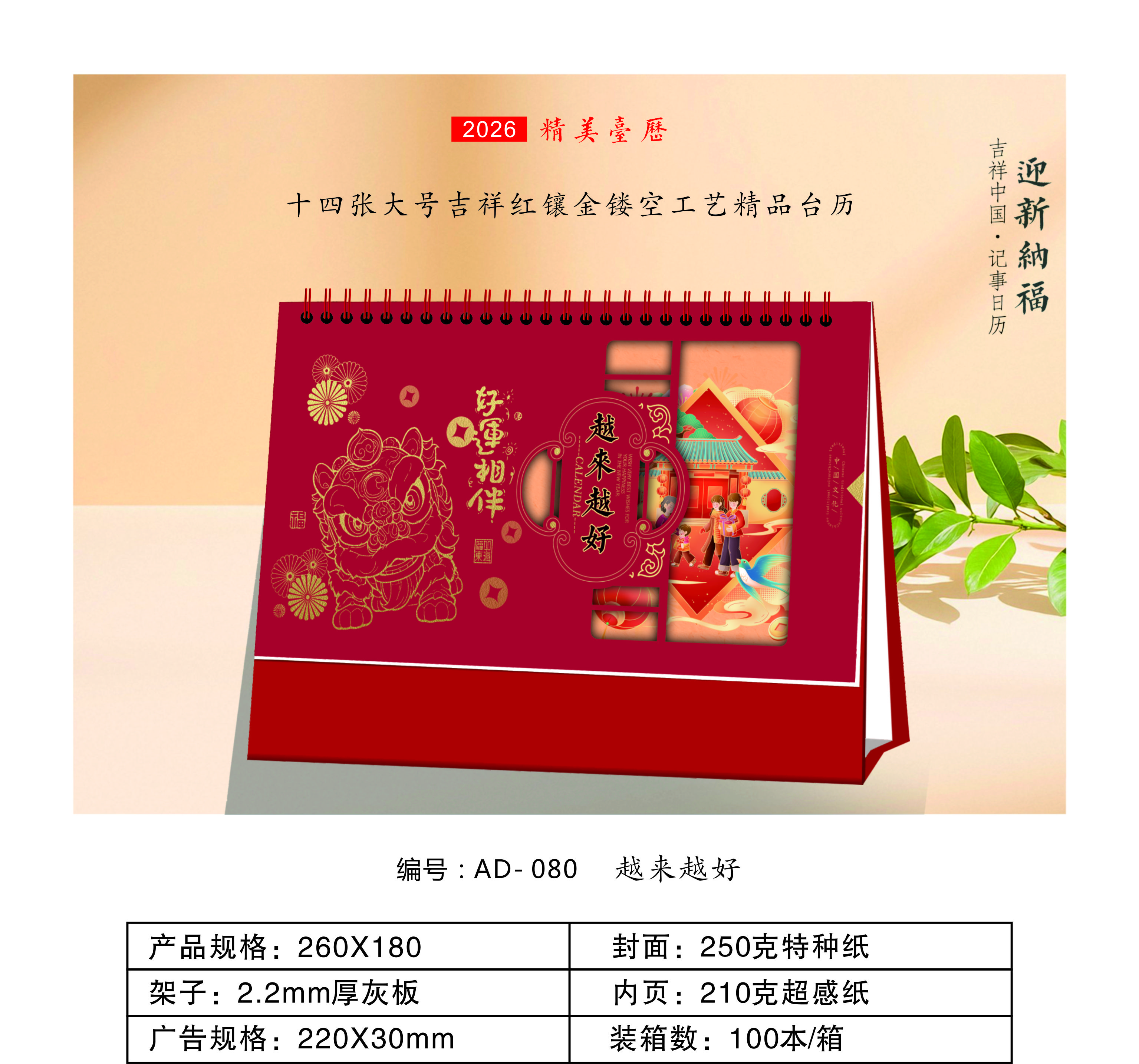 十四張大號吉祥紅鑲金鏤空工藝精品臺歷-越來越好