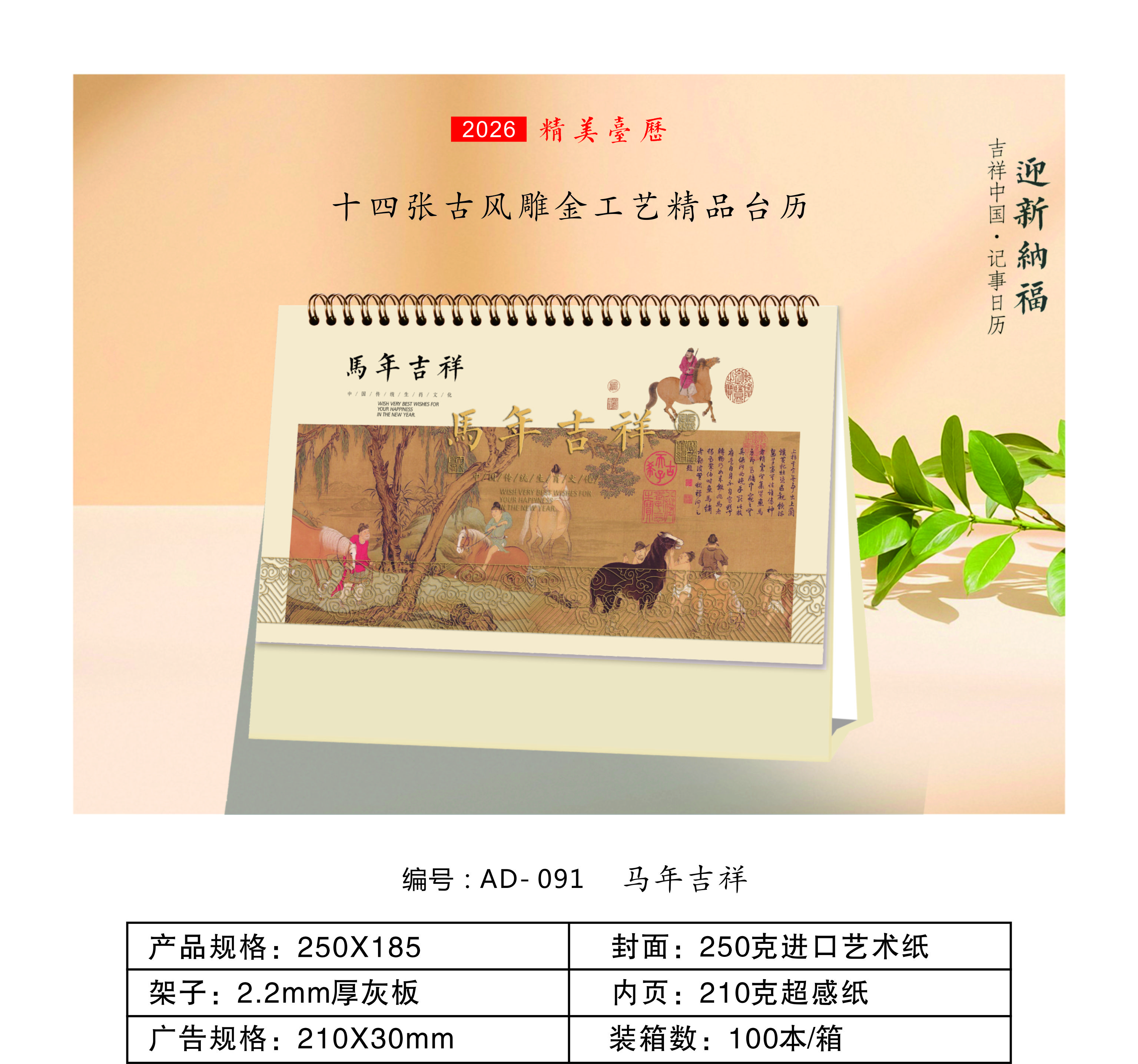 十四張古風(fēng)雕金布藝臺(tái)歷-馬年吉祥