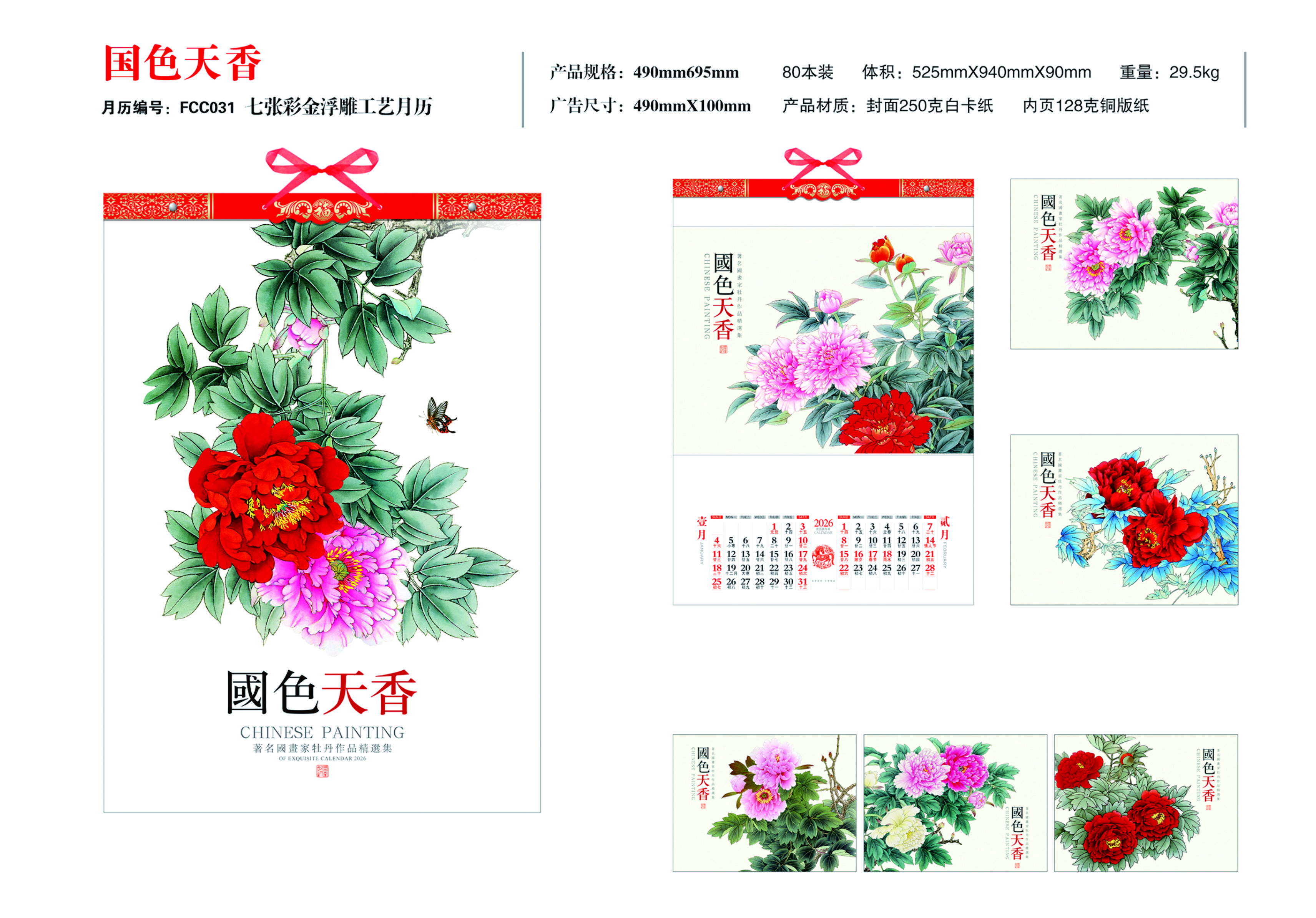 七張彩金浮雕工藝月歷-國(guó)色天香