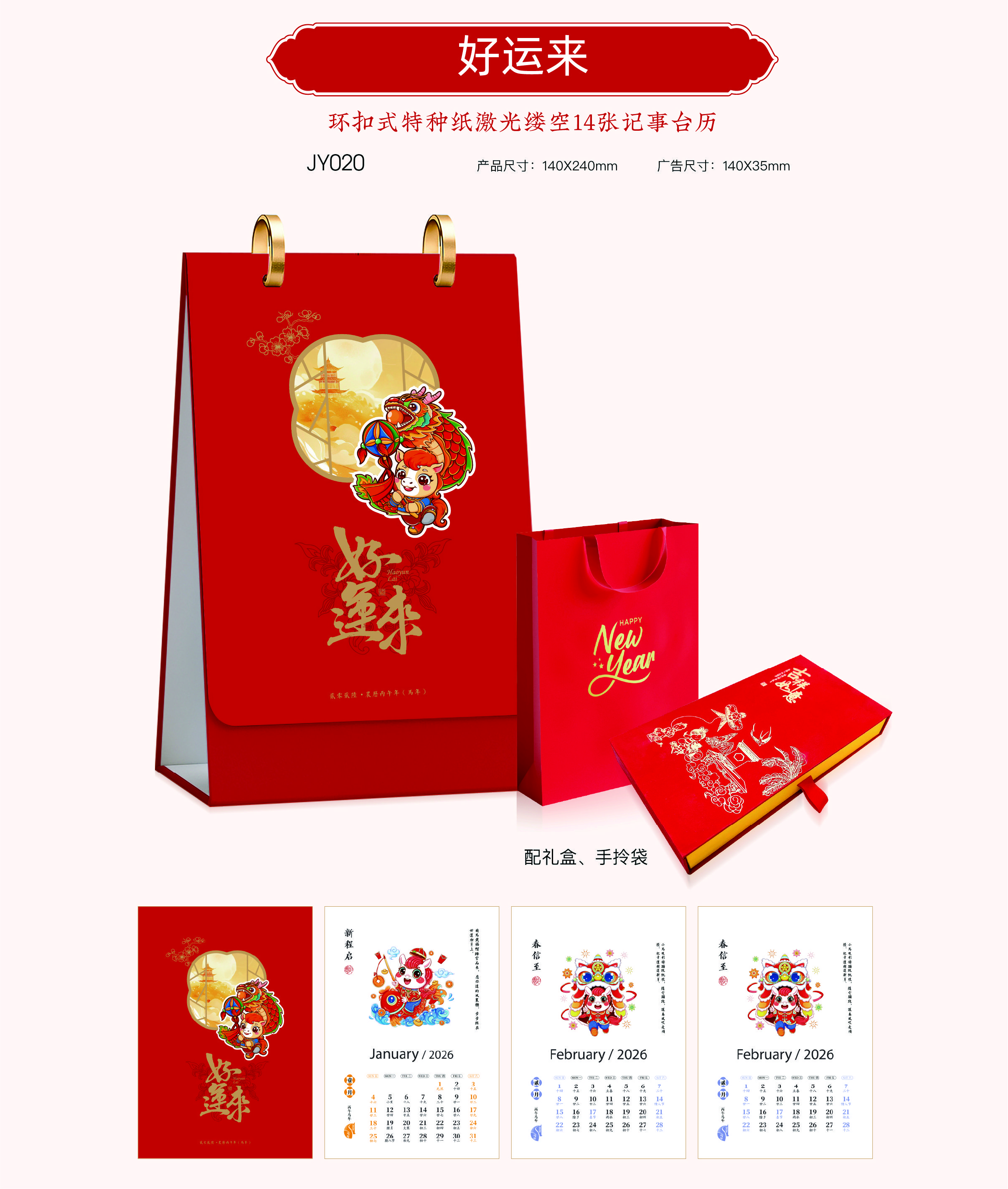 環(huán)扣式特種紙激光縷空十四張記事臺歷 -好運來