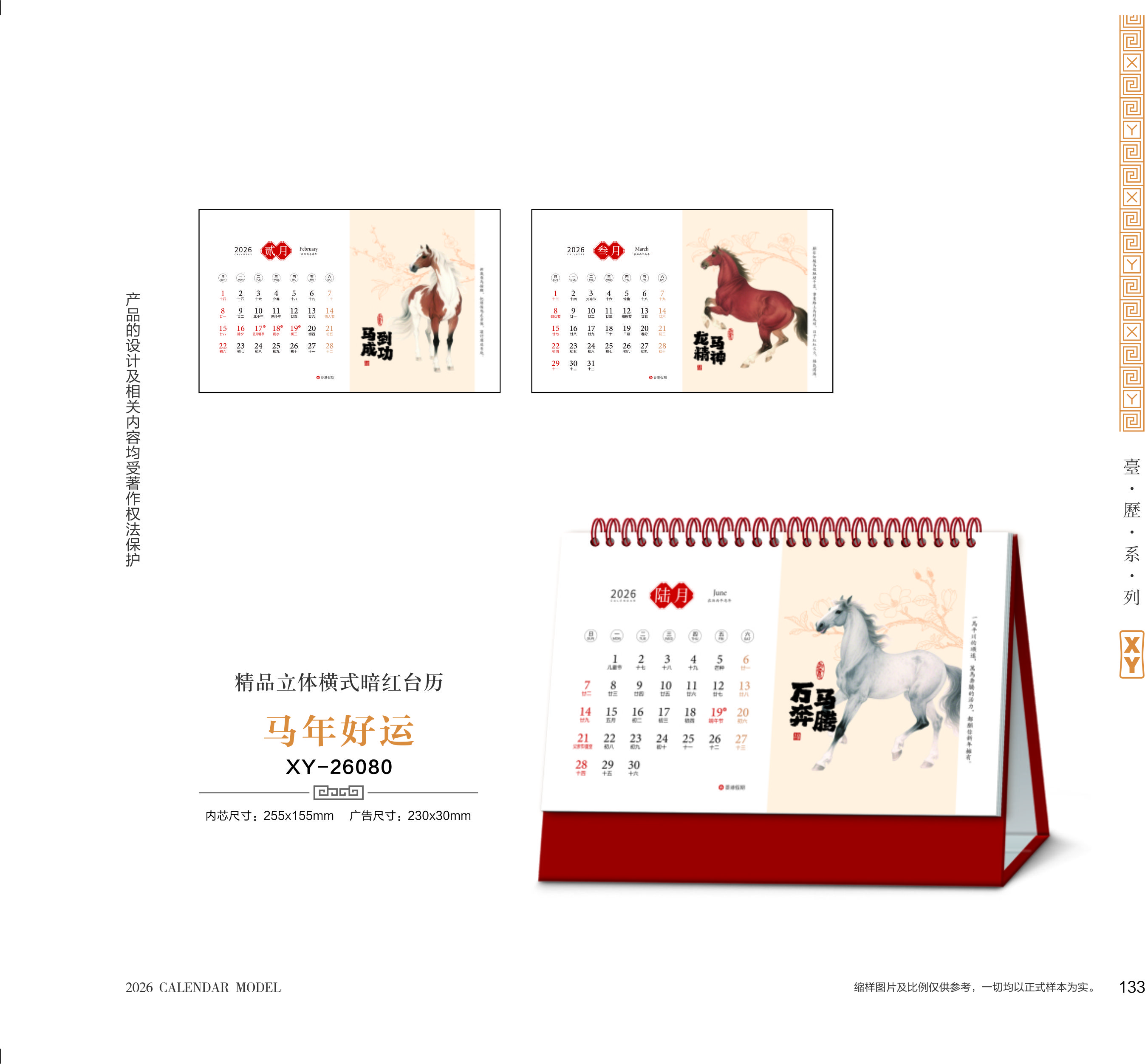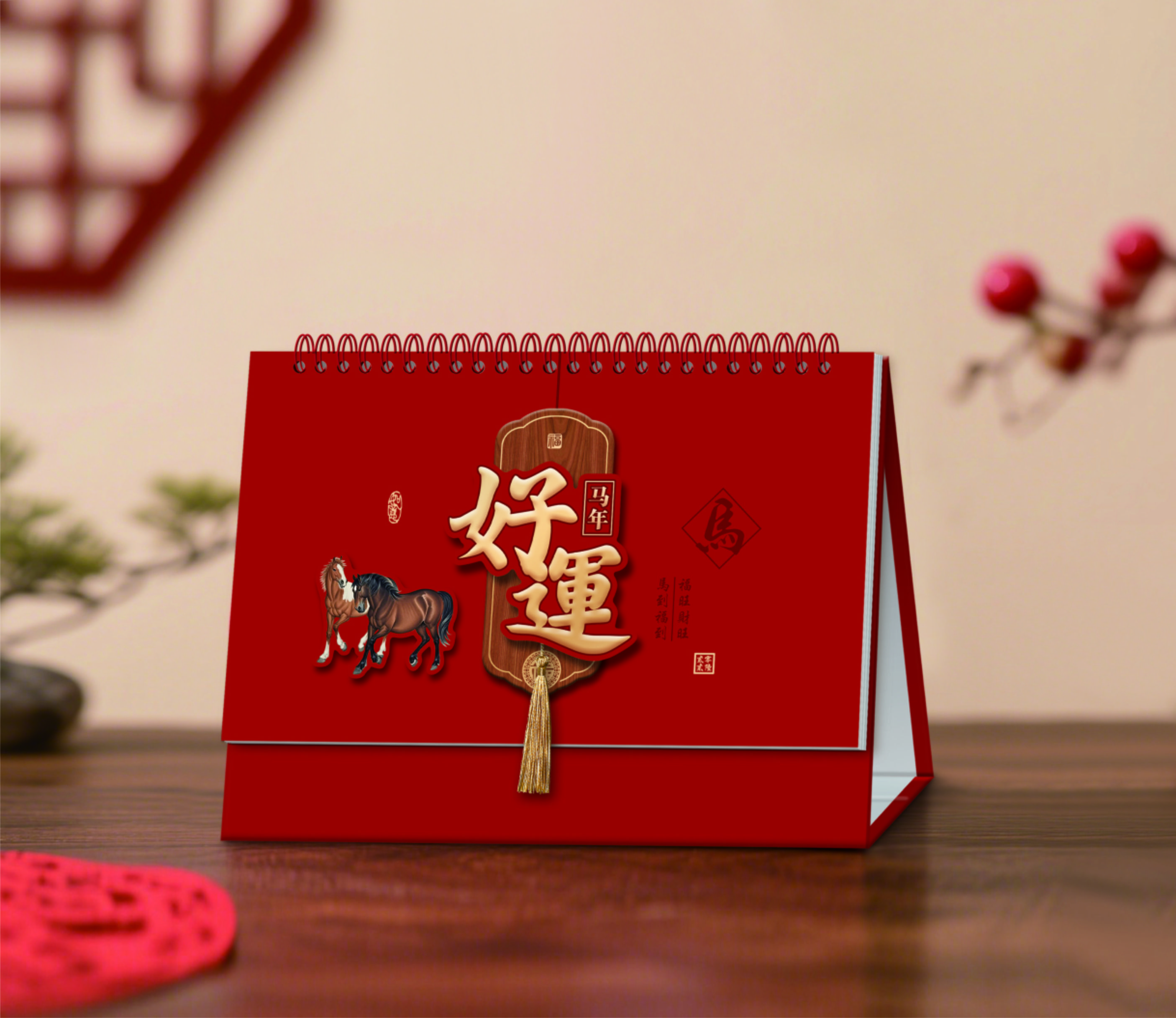 精品立體橫式暗紅臺歷-馬年好運