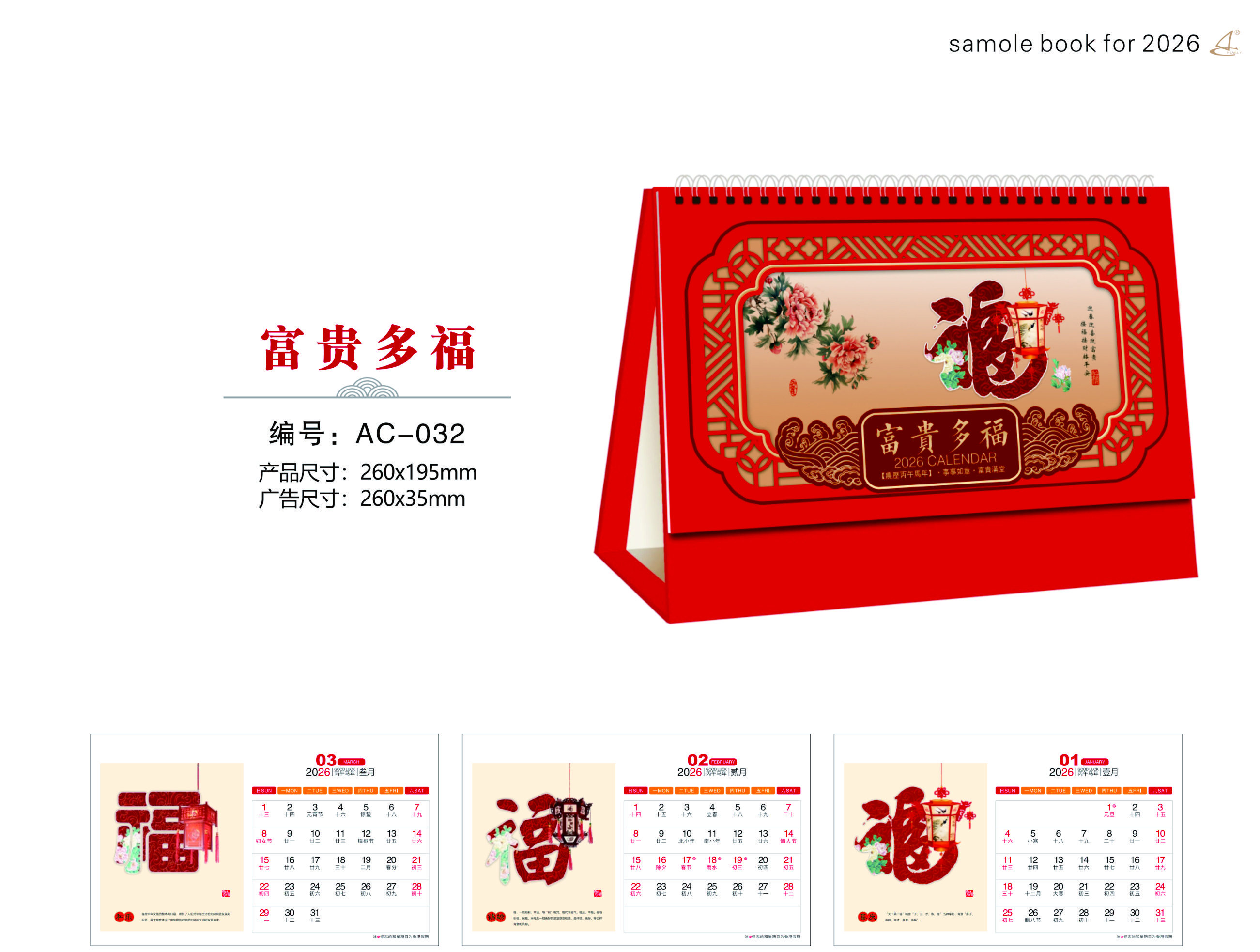 十四張觸感紅鏤空浮雕燙雙色金工藝臺歷-富貴多福
