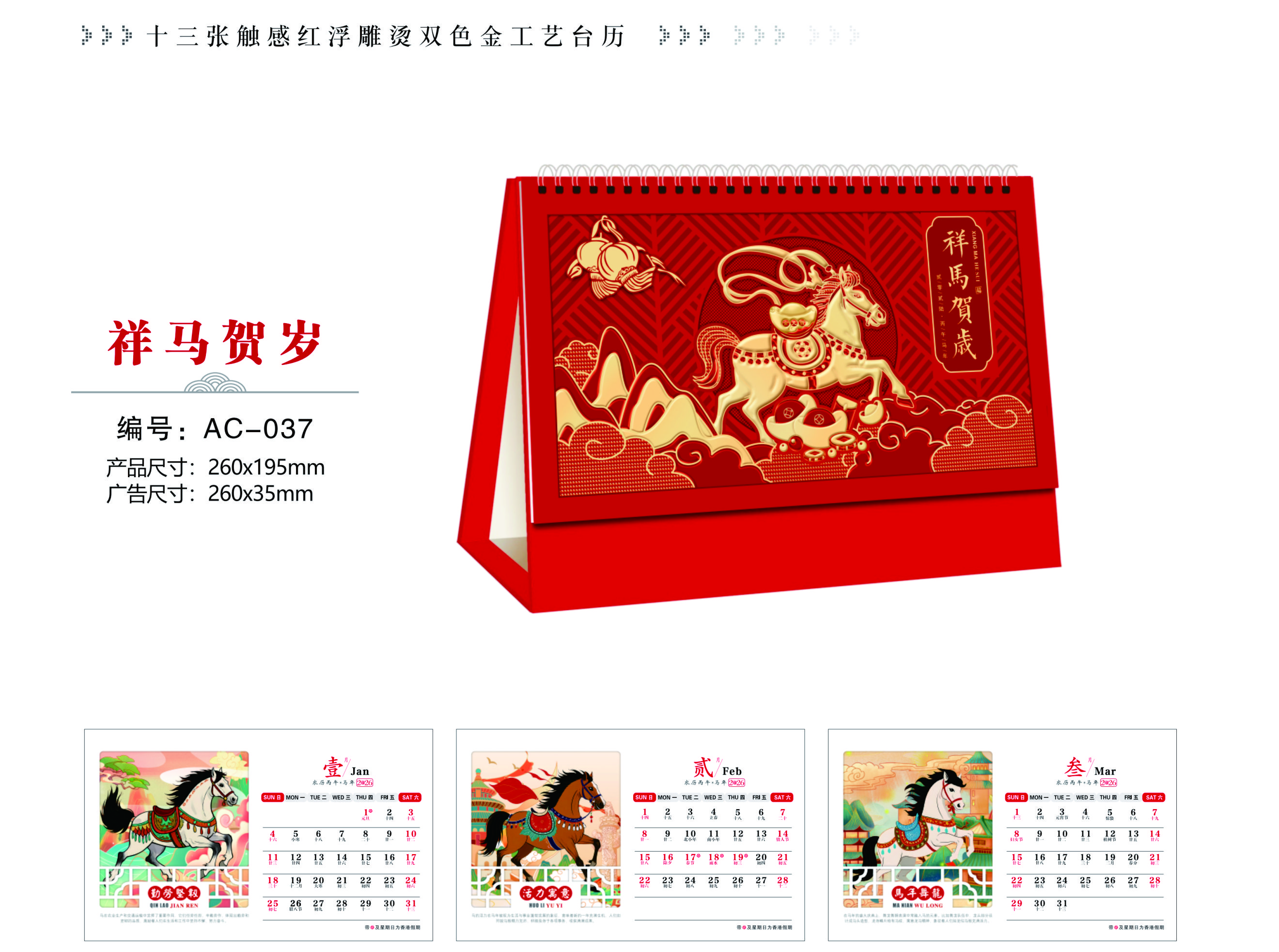 十三張觸感紅浮雕燙雙色金工藝臺(tái)歷-祥馬賀歲