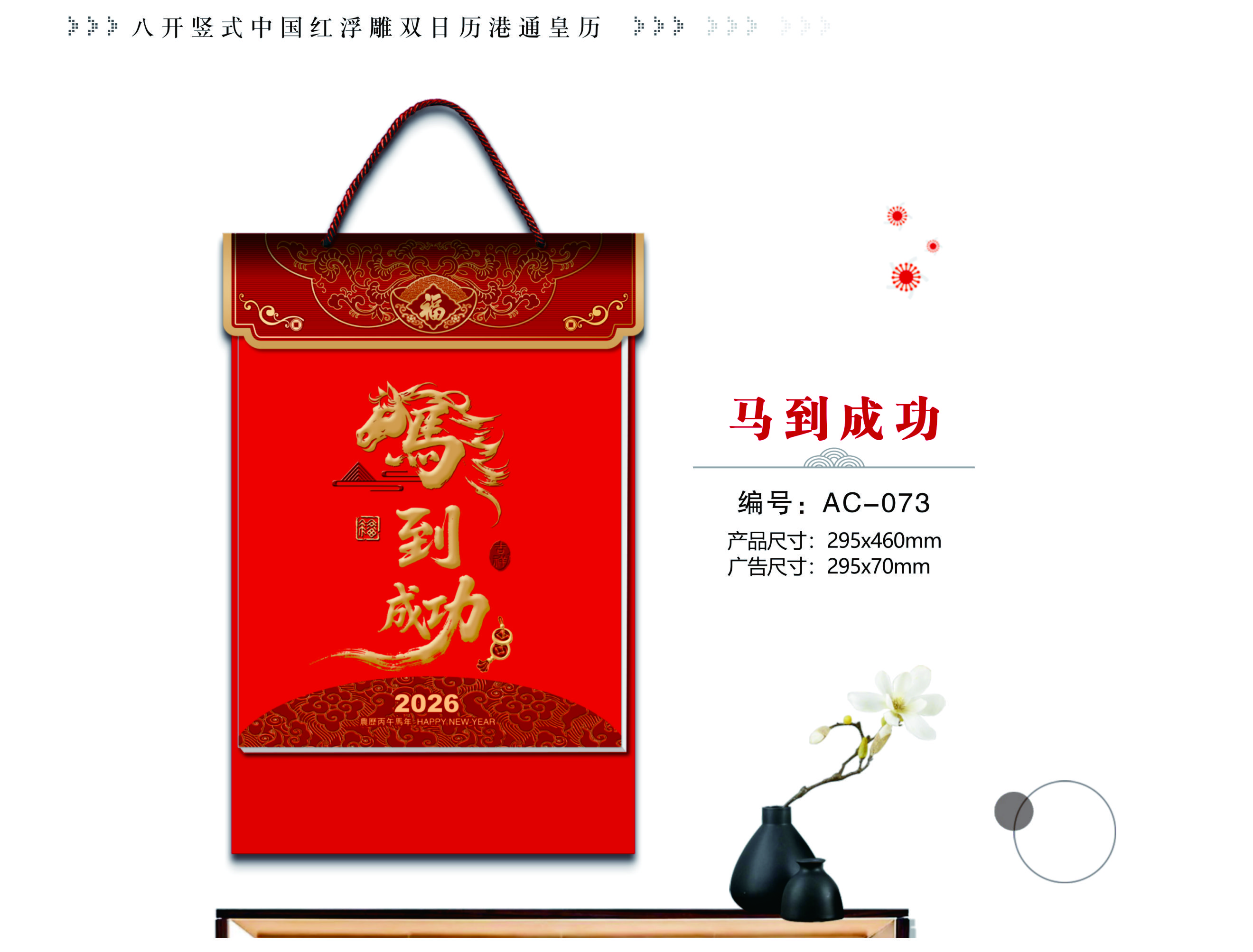 八開豎式中國紅浮雕雙日歷港通皇歷-馬到成功