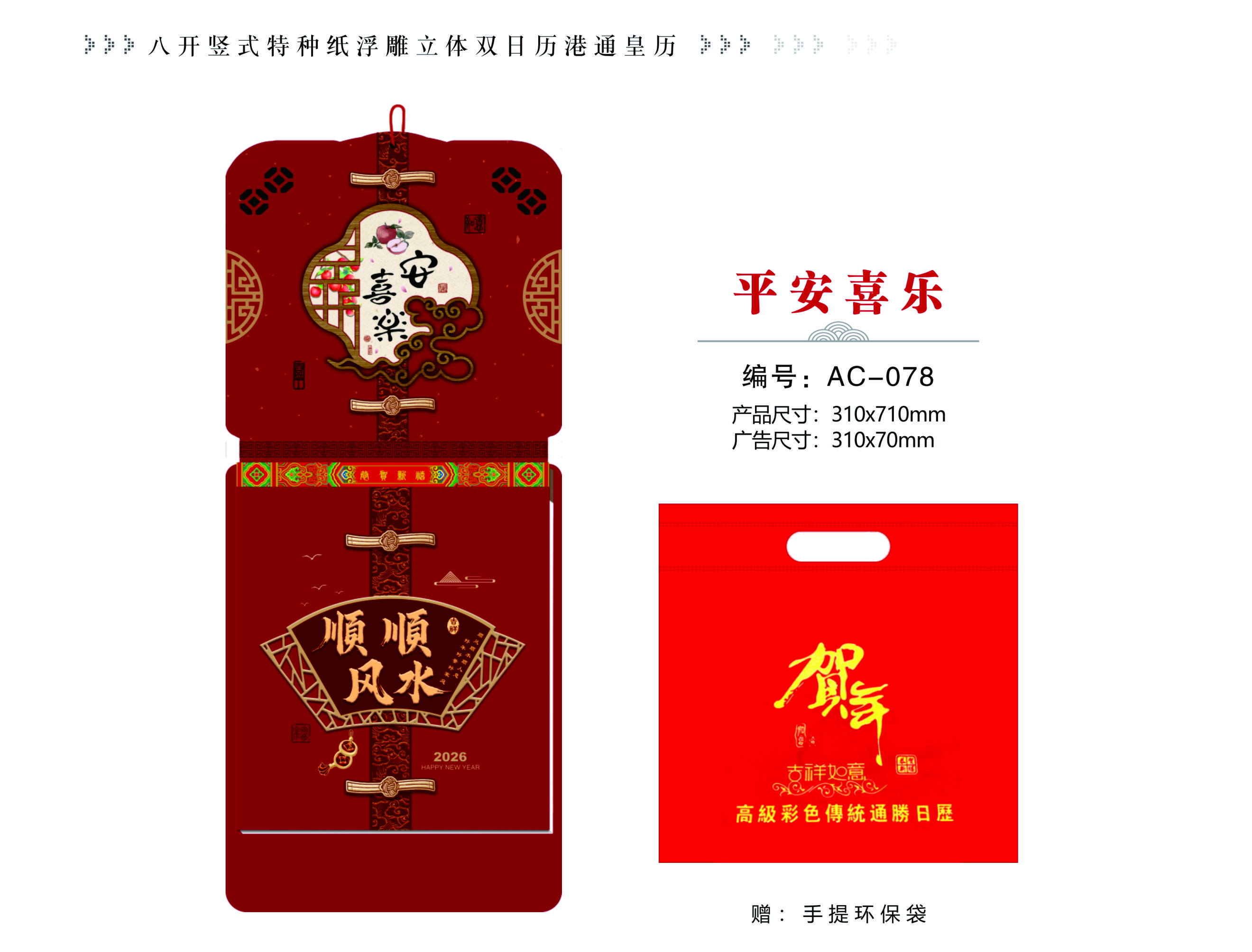八開(kāi)豎式特種紙浮雕立體雙日歷港通皇歷-平安喜樂(lè)